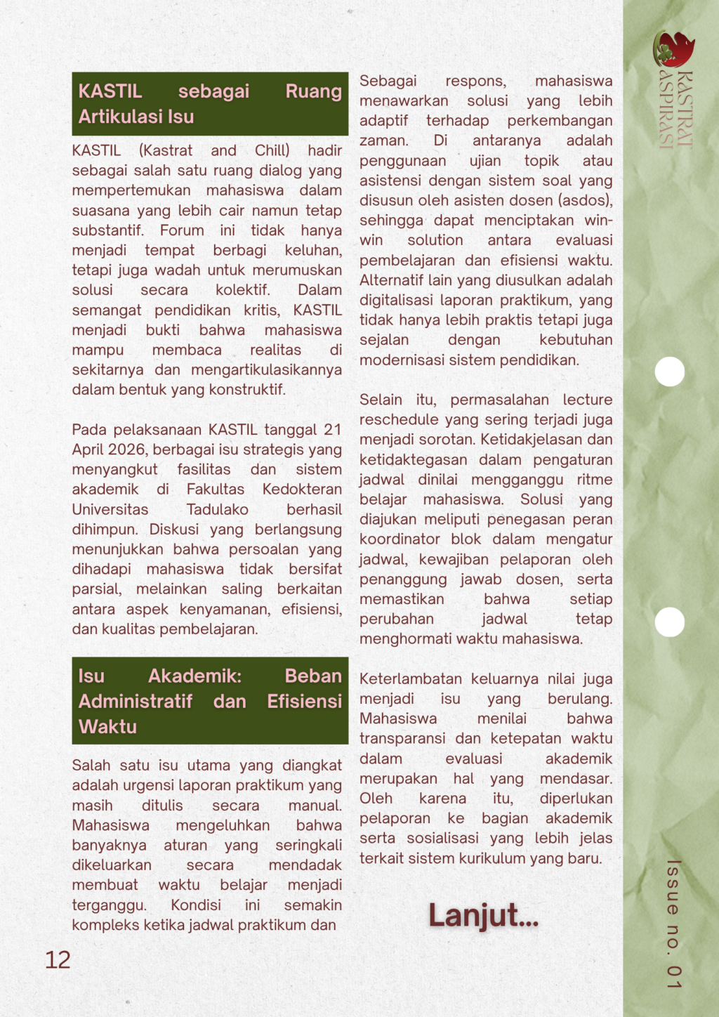 HomeARTIKEL & BERITAKASTIL : Praemis #1 Dari Keluhan ke Perubahan : Membaca Realitas Kampus dari Perspektif MahasiswaARTIKEL & BERITAKASTIL KASTIL : Praemis #1 Dari Keluhan ke Perubahan : Membaca Realitas Kampus dari Perspektif Mahasiswa bemfkuntad1 hari ago1 hari ago0 Comments Shares: Previous Post[ASUMSI MAHASISWA: Early-Onset Cancer: Apakah Usia Muda Benar-Benar Protektif?] Tinggalkan Balasan Batalkan balasanAlamat email Anda tidak akan dipublikasikan. Ruas yang wajib ditandai * Simpan nama, email, dan situs web saya pada peramban ini untuk komentar saya berikutnya.